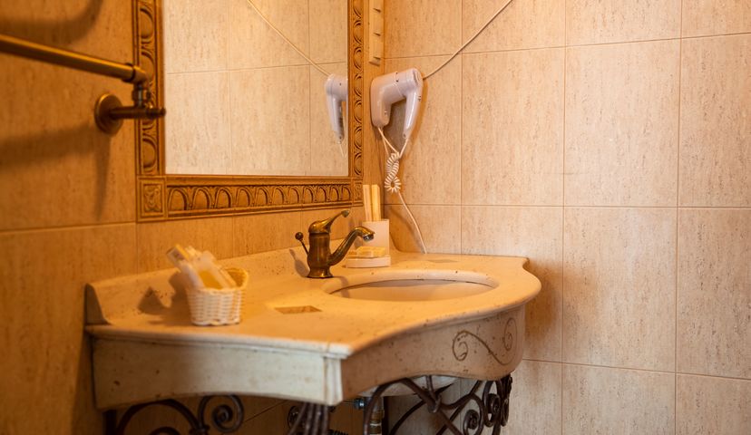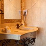 Ванная комната в бежевом цвете, оборудована душевой кабиной, санузлом с биде, феном, зеркалом и раковиной, изготовленными по индивидуальному заказу